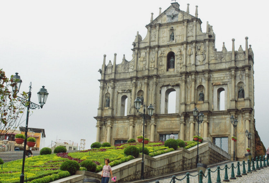 大三巴牌坊,其正式名称为圣保禄大教堂遗址,是澳门的标志性建筑物之一,2005年与澳门历史城区的其他文物成为联合国世界文化遗产。大三巴牌坊建筑糅合了欧洲文艺复兴时期与东方建筑的风格而成,体现出东西艺术的交融,雕刻精细,巍峨壮观。由三至五层构成三角金字塔形,无论是牌坊顶端高耸的十字架,还是铜鸽下面的圣婴雕像和被天使、鲜花环绕的圣母塑像,都充满着浓郁的宗教气氛,给人以美的享受。牌坊上各种雕像栩栩如生,堪称“立体的圣经”。