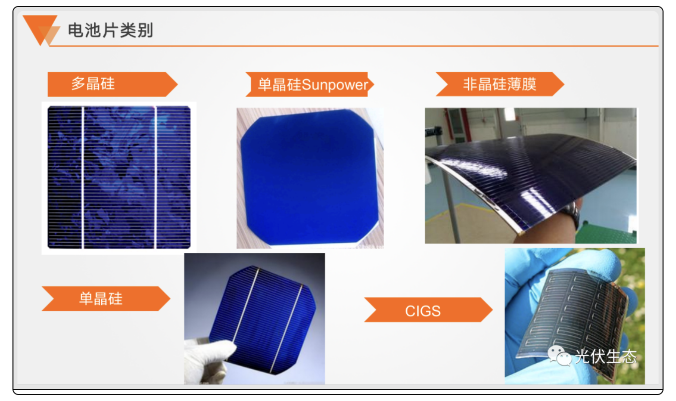 太阳能电池分为硅(silicon)太阳能电池(单晶硅、多晶硅、sunpower)、非晶体硅(cigs)等,目前使用最多的是高效能单晶硅,转化效率在22%—25%之间。
